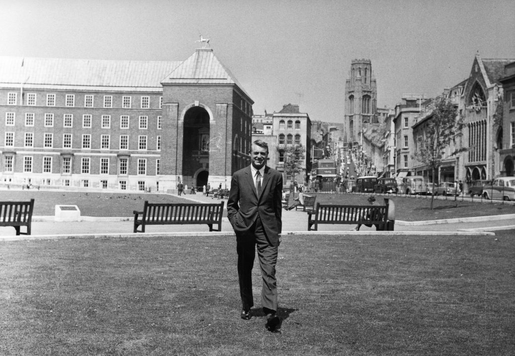 Cary Grant pictured on a visit home in front of Bristol City Hall in the 1950s